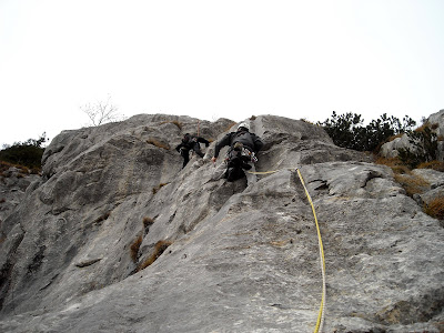 Arrivati alla seconda sosta decidiamo di scendere, non tanto per il freddo, quanto per le placche bagnate e pericolose. Nonostante la buona chiodatura riteniamo opportuno non rischiare e ci accontentiamo di quanto fatto.