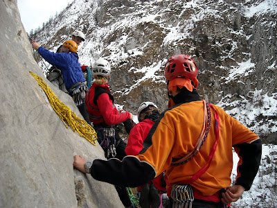 Infatti, già alla partenza il gelo pian piano ci faceva sentire il suo poco desiderato abbraccio, e al momento della partenza dell’ultima cordata le mani avevano il loro bel da fare a stringere i poveri appigli. Ma è bello anche così!