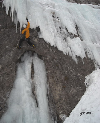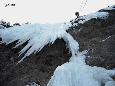 Continua l’attività del gruppo anche nell’esplorazione dell’effimero gioco del ghiaccio verticale. Avuta notizia della buona condizione del ghiaccio in Val Saisera, nel settore dietro al cimitero militare, Luca e Roberto si danno da fare sulle colate.