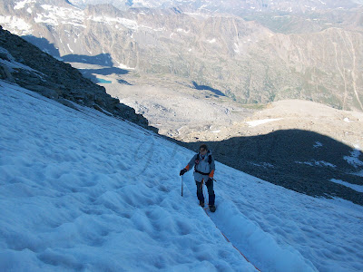 Durante la salita Fabrizio nota che, rispetto all’ultima volta che ha salito il Gran Paradiso, il ghiacciaio si è ritirato in diversi punti, di conseguenza la salita è un po’ più impegnativa.