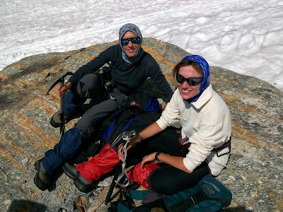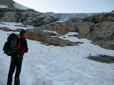 Dopo aver risalito le faticose morene, alle prime rampe di ghiaccio, ci leghiamo in due cordate Ida con Fabrizio e Mara con Roberto.