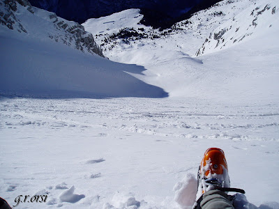 Già a Santo Stefano, Fabrizio, Alessandro, Loris, Luca e i due Roberto sono saliti in Raccolana alla ricerca di ghiaccio, avevamo deviato verso i piani per salire il colatoio di Forca da lis Sieris, tentativo fallito per il pericolo di distacco di cumuli dai pianori superiori.
