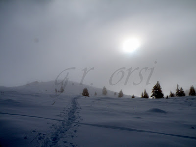 Saliti a piedi lungo la carrozzabile che sale da Sella Nevea i Piani ci hanno accolto in un’atmosfera suggestiva di neve e nebbia, ma poichè eravamo lì per “studiare” ci siamo messi subito al lavoro!
